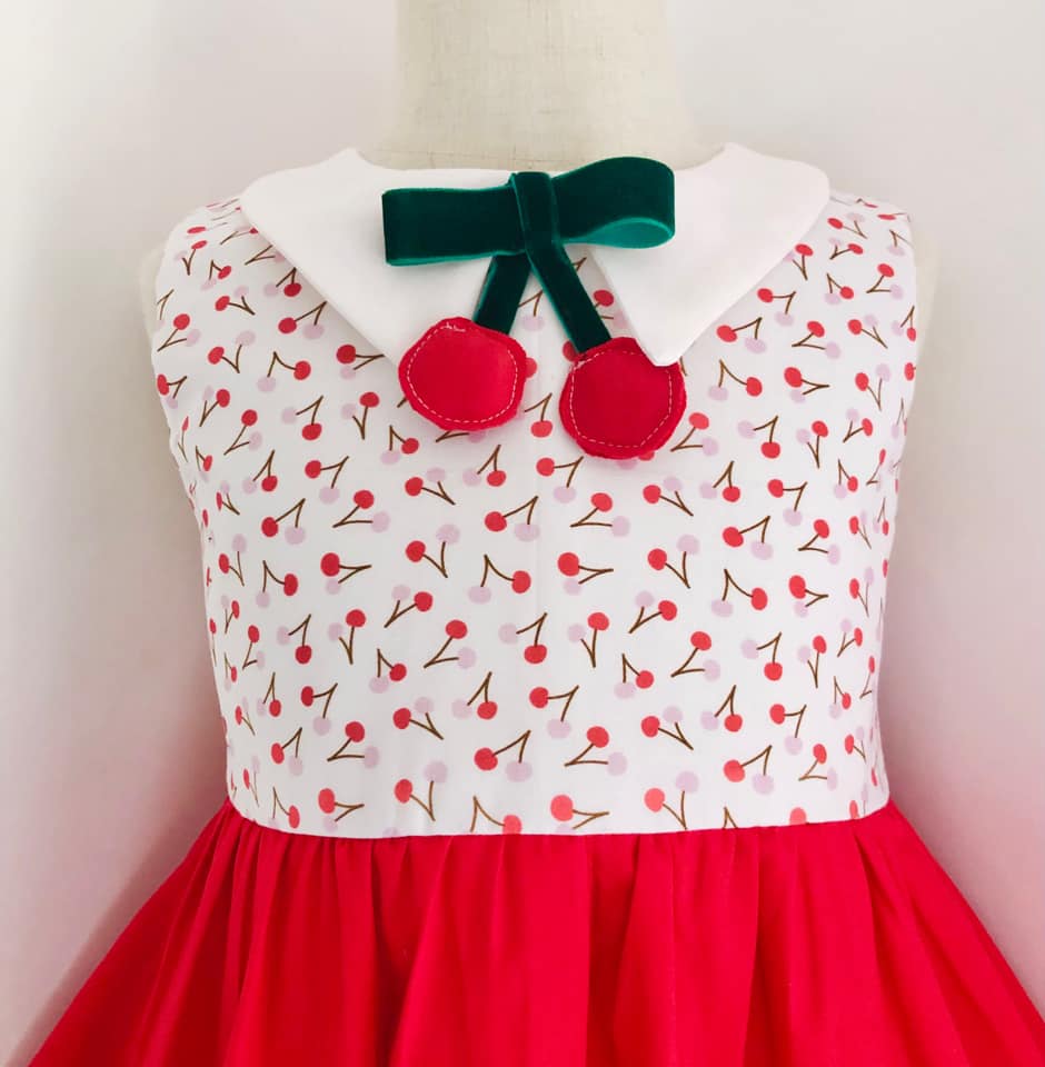 Introducing the cutest dress ever and of course with a cherry o n top!! This dress features a lined bodice, snaps in the back and a collar detail that is plush and is removable for washing. The circle skirt is perfect for twirling. This smart design looks great with knee socks or tights for col months or sandals and sneakers for warmer weather. The dress is made from cotton for durability and breathability. Hand wash in cold and lay flat to dry.
